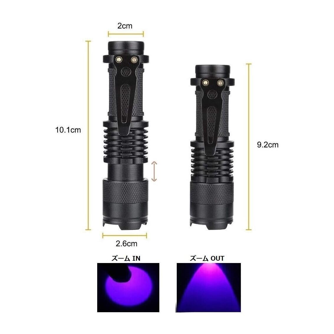ブラックライト LED 紫外線ライト UV懐中電灯 防水ミニLED 焦点調節可 强力 見えない汚れ対策 ペットのオシッコ探し 偽造検出 真贋判定 鉱物 宝石の趣味観察 蛍光剤確認 小型軽量 ズーム可能 乾電池式